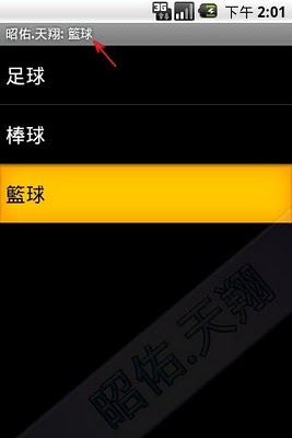 package com.jason.joysmsyd; import java.util.ArrayList;import java.util.HashMap;import java.util.List;import java.util.Map; import android.app.ListActivity;import android.content.Intent;import android.os.Bundle;import android.view.LayoutInflater;import android.view.View;import android.view.ViewGroup;import android.view.Window;import android.view.View.OnClickListener;import android.widget.BaseAdapter;import android.widget.Button;import android.widget.EditText;import android.widget.TextView; public class SendMain extends ListActivity implements OnClickListener{ Button buttonMessage,buttonContact,buttonHistory;EditText textMessage; List<Map<String,String>> contacts = new ArrayList<Map<String,String>>(); @Overrideprotected void onCreate(Bundle savedInstanceState) {// TODO Auto-generated method stubsuper.onCreate(savedInstanceState);this.requestWindowFeature(Window.FEATURE_NO_TITLE); this.setContentView(R.layout.layout_send); buttonMessage = (Button) this.findViewById(R.id.ButtonMessage);buttonContact = (Button) this.findViewById(R.id.ButtonContact);buttonHistory = (Button) this.findViewById(R.id.ButtonHistory); textMessage = (EditText)this.findViewById(R.id.EditTextMessage);textMessage.setText(this.getIntent().getExtras().getString("message")); } public void onClick(View v) {// TODO Auto-generated method stubswitch(v.getId()){case R.id.ButtonMessage:this.finish();break;case R.id.ButtonContact:{Intent intent = new Intent();intent.setAction("com.jason.action.contact");this.startActivityForResult(intent, 0);}break;case R.id.ButtonHistory:{Intent intent = new Intent();intent.setAction("com.jason.action.history");this.startActivityForResult(intent, 1);}break;} } protected void onActivityResult(int requestCode, int resultCode, Intent data) {// TODO Auto-generated method stubsuper.onActivityResult(requestCode, resultCode, data); if (requestCode == 0 && resultCode == RESULT_OK) {this.getcontactFromString(data.getExtras().getString(UserSelectActivity.RETURN_LIST));bindDataToList();}} private void getcontactFromString(String data) {if (data == null || data.length() == 0) {return;} String[] arrayContact = data.split("#");for (String singleContact : arrayContact) {if (singleContact != null && singleContact.length() > 0) {String[] props = singleContact.split(":");if (props.length == 2) {Map<String,String> contact = new HashMap<String,String>();contact.put("name", props[0]);contact.put("phone", props[1]);contacts.add(contact); }} } } private void bindDataToList(){this.setListAdapter(new MyAdapter());} public class MyAdapter extends BaseAdapter{ public int getCount() {// TODO Auto-generated method stubreturn contacts.size();} public Object getItem(int position) {// TODO Auto-generated method stubreturn contacts.get(position);} public long getItemId(int position) {// TODO Auto-generated method stubreturn position;} public View getView(int position, View convertView, ViewGroup parent) {// TODO Auto-generated method stubLayoutInflater inflater = SendMain.this.getLayoutInflater(); final View view = inflater.inflate(R.layout.layout_user_item, null); final TextView textPhone = (TextView) view.findViewById(R.id.text1); final TextView textName = (TextView) view.findViewById(R.id.text2); Button button = (Button)view.findViewById(R.id.buttonDelete); textPhone.setText(contacts.get(position).get("phone")); textName.setText(contacts.get(position).get("name")); button.setTag( position); button.setOnClickListener(new OnClickListener(){ public void onClick(View v) {// TODO Auto-generated method stubint position = Integer.parseInt(v.getTag().toString());contacts.remove(position);MyAdapter.this.notifyDataSetChanged(); //SendMain.this.getListView().refreshDrawableState();}}); return view;} }}public class helloWorld extends Activity { String[] vData = null; public void onCreate(Bundle savedInstanceState) { super.onCreate(savedInstanceState); // 要做为ArrayAdapter的资料来源 vData = new String[]{"足球","棒球","篮球"}; // 建立"阵列接收器" ArrayAdapter<String> arrayData = new ArrayAdapter<String>( this , android.R.layout.simple_list_item_1 , vData ); // 建立ListView 物件 ListView lv = new ListView(this); // 设定ListView 的接收器, 做为选项的来源 lv . setAdapter ( arrayData ); // ListView 设定Trigger lv . setOnItemClickListener ( new OnItemClickListener() { public void onItemClick (AdapterView<?> arg0, View arg1, int arg2, long arg3) { // TODO Auto-generated method stub setTitle( getResources().getString(R.string.app_name) + ": " + vData [ arg2 ]); } }); // 设定ListView 为ContentView setContentView(lv); }}