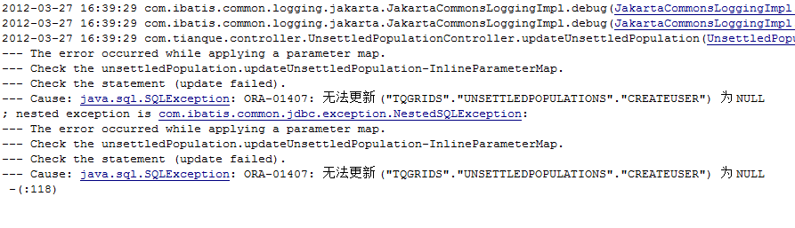 异常2 <update id="updateUnsettledPopulation" parameterproperty="createUser"> createUser=#createUser# </isPropertyAvailable> where id=#id# </dynamic></update><isNotNull.........</isNotNull>