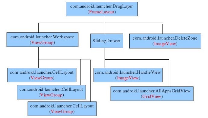 home screen的代码位于packages/apps/Launcher目录。从文件launcher.xml,workspace_screen.xml 可获知home screen的UI结构如下图所示: