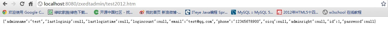 <bean id="mappingJacksonHttpMessageConverter" name="code">@RequestMapping(value="test2012",method = RequestMethod.GET)@ResponseBodypublic Object test(){Admin admin = new Admin();admin.setAdminname("test");admin.setEmail("test@qq.com");admin.setId(1);admin.setPhone("12345678900");return admin;}