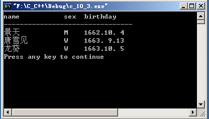 #include <stdio.h>struct date{int year,month,day;};struct person{char name[30],sex;struct date birthday;};struct person jt={"景天",'M',{1662,10,4}};void main(){static struct person txj={"唐雪见",'W',{1663,9,13}};static struct person lk={"龙葵",'W',{1663,10,5}};printf("name sex birthday\n");printf("--------------------------------\n");printf("%-14s %-4c %4d.%2d.%2d\n",jt.name,jt.sex,jt.birthday.year,jt.birthday.month,jt.birthday.day);printf("%-14s %-4c %4d.%2d.%2d\n",txj.name,txj.sex,txj.birthday.year,txj.birthday.month,txj.birthday.day);printf("%-14s %-4c %4d.%2d.%2d\n",lk.name,lk.sex,lk.birthday.year,lk.birthday.month,lk.birthday.day);}