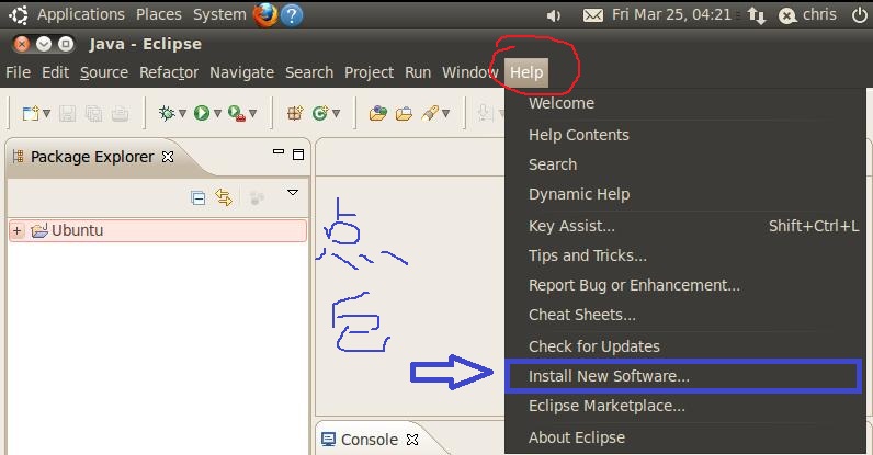 Eclipse,选择菜单“Help”并点击“Install New Software”项,如下图: