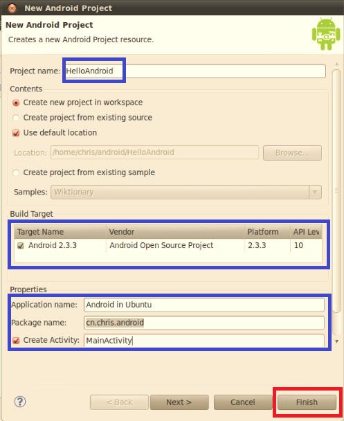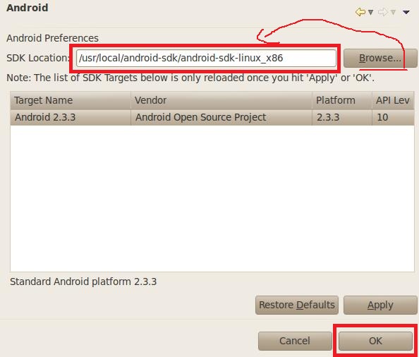 提示:如果Android API目标不出来,请先查看android-sdk-linux_x86文件夹的权限,必须要有可执行权限。昨晚我就遇到这问题了,弄了快一个小时,死活就找不到API目标,突然灵光一闪,权限!查之!改之!解决!。