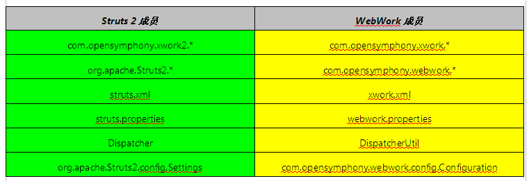 Struts 2和WebWork成员名称的对应表: