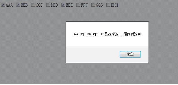 <!DOCTYPE html PUBLIC "-//W3C//DTD HTML 4.01 Transitional//EN" "http://www.w3.org/TR/html4/loose.dtd"><html><head><meta http-equiv="Content-Type" content="text/html; charset=UTF-8"><script type="text/javascript" src="http://ajax.googleapis.com/ajax/libs/jquery/1.4.1/jquery.min.js"></script><script>function clickCallBack(e){var rule = [["0","1","4"],["2","4"],["3","4"]];var ruleLabel = [["AAA","BBB","EEE"],["CCC","EEE"],["DDD","EEE"]];if(!checkCan(rule,ruleLabel)){e.checked =false;}}function contains(obj,a) {var i = a.length;while (i--) { if (a[i] == obj) { return true; }}return false;}function checkCan(rule,ruleLabel){var checkedVals = new Array();jQuery("input[name=test]:checked").each(function(){checkedVals.push($(this).val());});jQuery.each(rule,function(index){ var ruleItem = $(this);var flag =0;for(i=0;i<ruleItem.length;i++){if(contains(ruleItem[i], checkedVals)){ flag++; }}if(flag>=ruleItem.length) {var ruleLabelItem = ruleLabel[index];var promote = "";var labelSize = ruleLabelItem.length;for(i=0;i<labelSize;i++){if(i < labelSize - 1){ promote += "'" + ruleLabelItem[i] + "'同";} else {promote += "'" + ruleLabelItem[i] + "'";}}alert(promote+"是互斥的,不能同时选中!");return false;}});return true;}</script><title>Insert title here</title></head><body> <input type="checkbox" name="test" value="0" onclick="clickCallBack(this)"/>AAA <input type="checkbox" name="test" value="1" onclick="clickCallBack(this)"/>BBB <input type="checkbox" name="test" value="2" onclick="clickCallBack(this)"/>CCC <input type="checkbox" name="test" value="3" onclick="clickCallBack(this)"/>DDD <input type="checkbox" name="test" value="4" onclick="clickCallBack(this)"/>EEE <input type="checkbox" name="test" value="5" onclick="clickCallBack(this)"/>FFF <input type="checkbox" name="test" value="6" onclick="clickCallBack(this)"/>GGG <input type="checkbox" name="test" value="7" onclick="clickCallBack(this)"/>HHH</body></html>