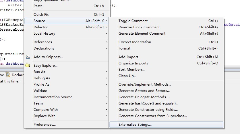 1.首先可以通过快捷键 ALT+SHIFT+S 然后选择最下面的 Externalize Strings... 选项 / 或者在一个类文件的代码中 右键-->Source-->Externalize Strings... 选项