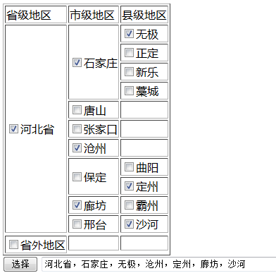 <!DOCTYPE html PUBLIC "-//W3C//DTD HTML 4.01 Transitional//EN" "http://www.w3.org/TR/html4/loose.dtd"><html><head><meta http-equiv="Content-Type" content="text/html; charset=UTF-8"><title>Insert title here</title></head><body><form action="" ><div ><tr><td>省级地区</td><td>市级地区</td><td>县级地区</td></tr><tr><td rowspan="11"><input type="checkbox" id="Areacheckbox" name="areaCB" value="河北省" />河北省</td><td rowspan="4"><input type="checkbox" id="Areacheckbox" name="areaCB" value="石家庄" />石家庄</td><td><input type="checkbox" id="Areacheckbox" name="areaCB" value="无极" />无极</td></tr><tr><td><input type="checkbox" id="Areacheckbox" name="areaCB" value="正定" />正定</td></tr><tr><td><input type="checkbox" id="Areacheckbox" name="areaCB" value="新乐" />新乐</td></tr><tr><td><input type="checkbox" id="Areacheckbox" name="areaCB" value="藁城" />藁城</td></tr><tr><td><input type="checkbox" id="Areacheckbox" name="areaCB" value="唐山" />唐山</td><td></td></tr><tr><td><input type="checkbox" id="Areacheckbox" name="areaCB" value="张家口" />张家口</td><td></td></tr><tr><td><input type="checkbox" id="Areacheckbox" name="areaCB" value="沧州" />沧州</td><td></td></tr><tr><td rowspan="2"><input type="checkbox" id="Areacheckbox" name="areaCB" value="保定" />保定</td><td><input type="checkbox" id="Areacheckbox" name="areaCB" value="曲阳" />曲阳</td></tr><tr><td><input type="checkbox" id="Areacheckbox" name="areaCB" value="定州" />定州</td></tr><tr><td rowspan="1"><input type="checkbox" id="Areacheckbox" name="areaCB" value="廊坊" />廊坊</td><td><input type="checkbox" id="Areacheckbox" name="areaCB" value="霸州" />霸州</td></tr><tr><td rowspan="1"><input type="checkbox" id="Areacheckbox" name="areaCB" value="邢台" />邢台</td><td><input type="checkbox" id="Areacheckbox" name="areaCB" value="沙河" />沙河</td></tr><tr><tr><td rowspan="0"><input type="checkbox" id="Areacheckbox" name="areaCB" value="省外地区" />省外地区</td><td></td><td></td></tr><tr><tr></table></div><input type="button" value="选择" name="btn" /><input id="tags" style="width:500px;" type="text"/><script type="text/javascript" src="http://ajax.googleapis.com/ajax/libs/jquery/1.6.2/jquery.min.js">引入jquery</script><script type="text/javascript"> var checkBox = $('div.item input[type=checkbox]'), tagsBox = $('#tags'); checkBox.change(function(){ var s=[]; for(var i=0;i<checkBox.length;i++) if(checkBox[i].checked) s.push(checkBox[i].value); tagsBox.val(s.join(',')); });</script></form></body></html>