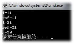 #include<iostream>using namespace std;int main(int argc,char** argv){ int i=10; int& ref=i; ref++; cout<<"i="<<i<<endl; cout<<"ref="<<ref<<endl; int j=20; ref=j; ref++; cout<<"i="<<i<<endl; cout<<"ref="<<ref<<endl; cout<<"j="<<j<<endl; return 0;}