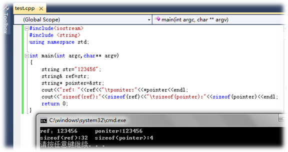 再次,引用的大小是所指向的变量的大小,因为引用只是一个别名而已;指针是指针本身的大小,4个字节。见下图所示: