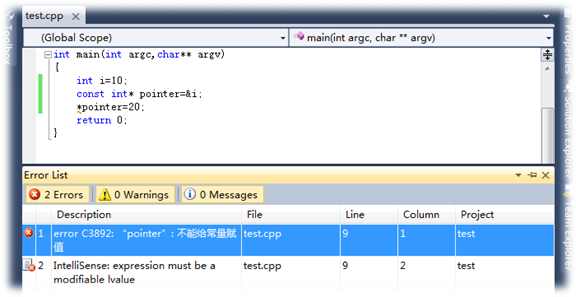 常量指针定义"const int* pointer=&a"告诉编译器,*pointer是常量,不能将*pointer作为左值进行操作。