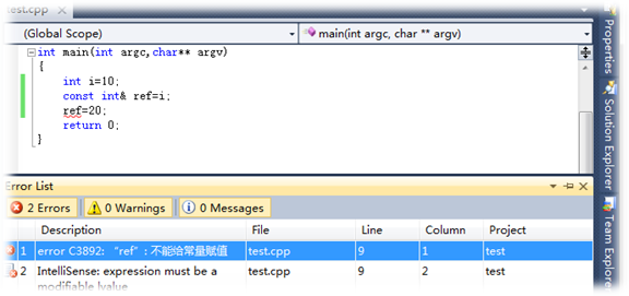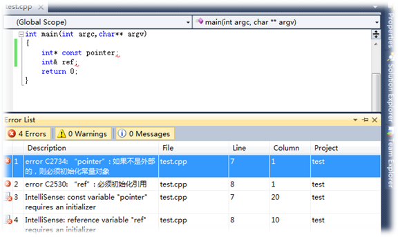 首先,引用不可以为空,但指针可以为空。前面也说过了引用是对象的别名,引用为空——对象都不存在,怎么可能有别名!故定义一个引用的时候,必须初始化。因此如果你有一个变量是用于指向另一个对象,但是它可能为空,这时你应该使用指针;如果变量总是指向一个对象,i.e.,你的设计不允许变量为空,这时你应该使用引用。如下图中,如果定义一个引用变量,不初始化的话连编译都通不过(编译时错误):