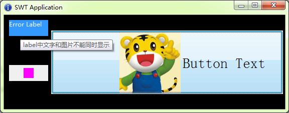 import org.eclipse.swt.graphics.Color;import org.eclipse.swt.graphics.Font;import org.eclipse.swt.graphics.Image;import org.eclipse.swt.graphics.ImageData;import org.eclipse.swt.graphics.PaletteData;import org.eclipse.swt.widgets.Display;import org.eclipse.swt.widgets.Shell;import org.eclipse.swt.widgets.Label;import org.eclipse.swt.SWT;import org.eclipse.wb.swt.SWTResourceManager;import org.eclipse.swt.widgets.Button;public class TestColorImageFont {static Display display = Display.getDefault();//三种颜色获取方式static Color white = new Color(display, 255, 255, 255);static Color sysBlack = display.getSystemColor(SWT.COLOR_BLACK);static Color swtBlue = SWTResourceManager.getColor(SWT.COLOR_LIST_SELECTION);//两种图片获取方式,外加自己生成图片自己写数据static Image errorIcon = display.getSystemImage(SWT.ICON_ERROR); //内置图像static Image tigerIcon = new Image(display, "hu.jpg");//读取的图像//自己生成图像,参数为 图像宽、高,颜色的depth,RGB的掩膜(RGB对应的bit)static ImageData imageData=new ImageData(20, 20, 24, new PaletteData(0xFF0000, 0xFF00, 0xFF));static Image createdIcon=new Image(display, imageData);//难道是独立的?设置完数据重新生成才有效!!!否则是黑的而且直接设置图片的内容也不行!!!//字体static Font sysFont = display.getSystemFont();static Font songFont = new Font(display, "宋体", 22, SWT.NONE);public static void main(String[] args) {//设置生成的图像的内容for (int x = 0; x < imageData.width; x++) {for (int y = 0; y < imageData.height; y++) {imageData.setPixel(x, y, 0xFF00FF);//createdIcon.getImageData().setPixel(x, y, 0xFF00FF);//没用啊!!!}}createdIcon=new Image(display, imageData);//不加此行改了图片数据也无效啊!!!Shell shell = new Shell();shell.setSize(576, 226);shell.setText("SWT Application");shell.setBackground(sysBlack);shell.setImage(display.getSystemImage(SWT.ICON_WORKING));Label lblErr = new Label(shell, SWT.NONE);lblErr.setForeground(white);//前景颜色lblErr.setBackground(swtBlue);//背景颜色lblErr.setBounds(10, 10, 78, 32);//lblNewLabel.setImage(errorIcon); //label中文字和图片不能同时显示lblErr.setText("Error Label");lblErr.setToolTipText("label中文字和图片不能同时显示");Button btn = new Button(shell, SWT.NONE);btn.setAlignment(SWT.RIGHT);btn.setBounds(94, 31, 462, 127);btn.setText("Button Text");btn.setImage(tigerIcon);//图片btn.setFont(songFont);//字体Label lblCreate=new Label(shell, SWT.NONE);lblCreate.setAlignment(SWT.CENTER);lblCreate.setBounds(10, 100, 78, 32);lblCreate.setImage(createdIcon);shell.open();shell.layout();while (!shell.isDisposed()) {if (!display.readAndDispatch()) {display.sleep();}}}}