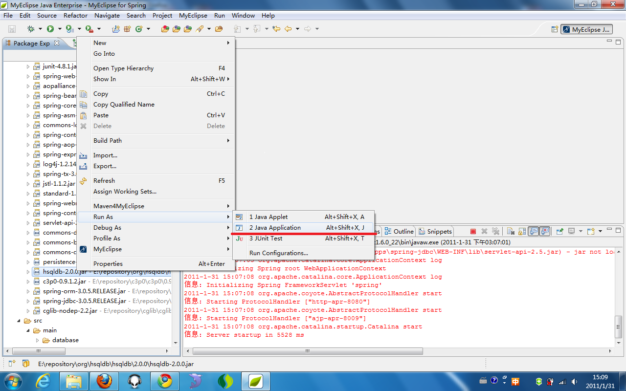 启动服务器后,找到hsqldb-**.jar 右键点击 run as - java application