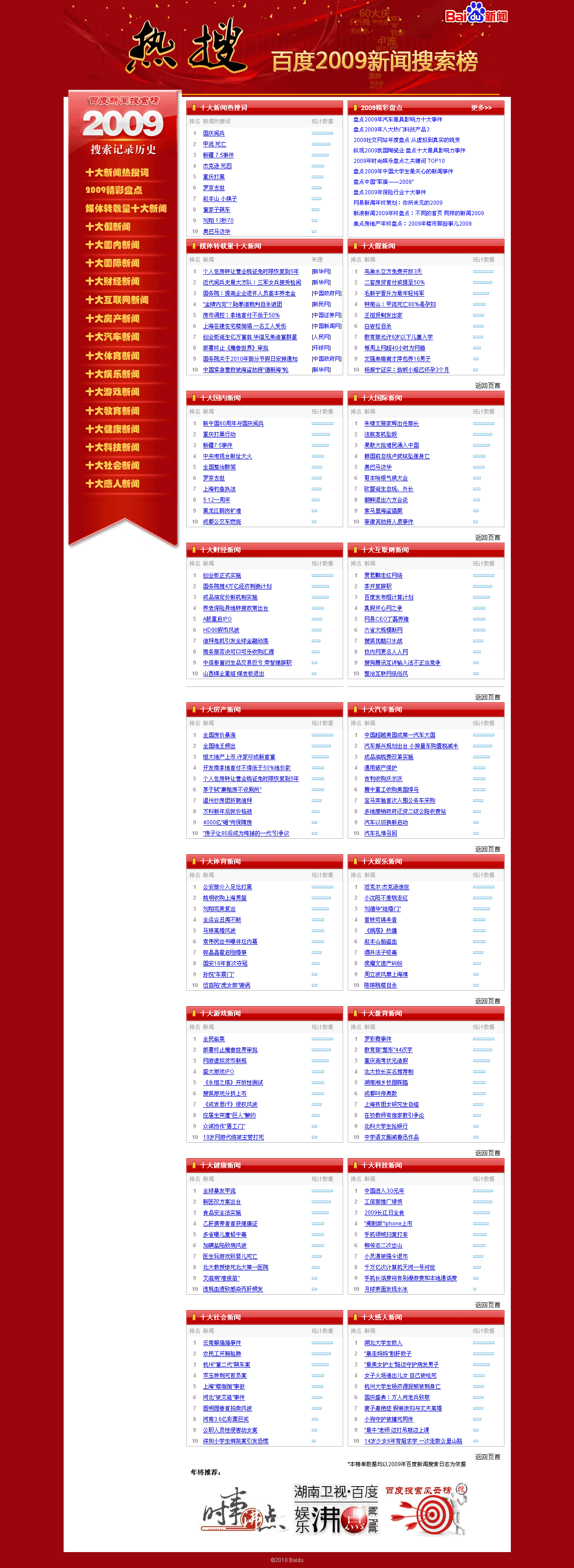 百度热榜全部是top10的新闻,分类很详细,可以看到09年度社会热点。