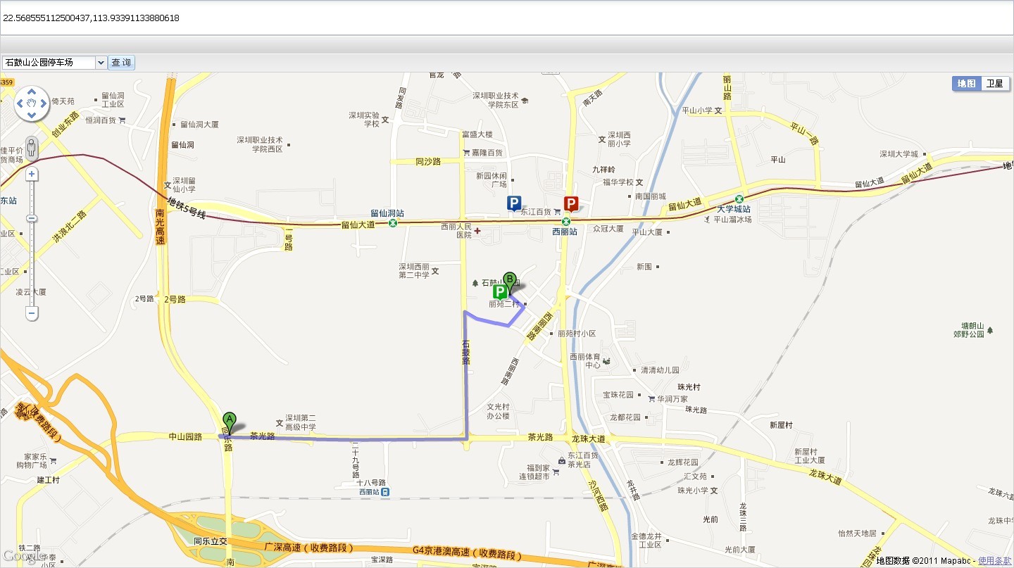 @Overridepublic List<ParkData> getParks() {//如果你数据库中有数据//return parkDataManager.getAll();List<ParkData> datas = new ArrayList<ParkData>();ParkData data = new ParkData();data.setAllNum("150");data.setLastNum("88");data.setIcon("parking_green.png");data.setId(1);data.setLat(22.57604477669078);data.setLng(113.95060540771487);data.setParkName("石鼓山公园停车场");data.setTel("18675511111");data.setDescs("每小时2元");data.setUpdateTime("2011-08-18 17:55:24");data.setAddress("石鼓山路1号");datas.add(data);ParkData data2 = new ParkData();data2.setAllNum("80");data2.setLastNum("0");data2.setIcon("parking_red.png");data2.setId(2);data2.setLat(22.58099803468149);data2.setLng(113.95493985748294);data2.setParkName("西丽天虹购物中心停车场");data2.setTel("0755-23336868");data2.setDescs("每小时5元");data2.setUpdateTime("2011-08-18 17:56:27");data2.setAddress("沙河西路2345号");datas.add(data2);ParkData data3 = new ParkData();data3.setAllNum("120");data3.setLastNum("50");data3.setIcon("parking_blue.png");data3.setId(2);data3.setLat(22.581047566362173);data3.setLng(113.9514744434357);data3.setParkName("西丽医院停车场");data3.setTel("0755-86655555");data3.setDescs("每小时3元");data3.setUpdateTime("2011-08-18 16:02:20");data3.setAddress("留仙大道54号");datas.add(data3);return datas;}import java.util.List;import com.extjs.gxt.ui.client.GXT;import com.extjs.gxt.ui.client.Registry;import com.extjs.gxt.ui.client.Style.LayoutRegion;import com.extjs.gxt.ui.client.Style.Scroll;import com.extjs.gxt.ui.client.event.ButtonEvent;import com.extjs.gxt.ui.client.event.SelectionListener;import com.extjs.gxt.ui.client.store.ListStore;import com.extjs.gxt.ui.client.util.Theme;import com.extjs.gxt.ui.client.widget.ContentPanel;import com.extjs.gxt.ui.client.widget.Viewport;import com.extjs.gxt.ui.client.widget.button.Button;import com.extjs.gxt.ui.client.widget.form.ComboBox;import com.extjs.gxt.ui.client.widget.form.ComboBox.TriggerAction;import com.extjs.gxt.ui.client.widget.form.TextField;import com.extjs.gxt.ui.client.widget.layout.BorderLayout;import com.extjs.gxt.ui.client.widget.layout.BorderLayoutData;import com.extjs.gxt.ui.client.widget.layout.FitLayout;import com.extjs.gxt.ui.client.widget.toolbar.ToolBar;import com.google.gwt.core.client.EntryPoint;import com.google.gwt.core.client.GWT;import com.google.gwt.core.client.JavaScriptObject;import com.google.gwt.maps.client.HasMapOptions;import com.google.gwt.maps.client.MapOptions;import com.google.gwt.maps.client.MapTypeId;import com.google.gwt.maps.client.MapWidget;import com.google.gwt.maps.client.base.HasInfoWindow;import com.google.gwt.maps.client.base.HasInfoWindowOptions;import com.google.gwt.maps.client.base.HasLatLng;import com.google.gwt.maps.client.base.InfoWindow;import com.google.gwt.maps.client.base.InfoWindowOptions;import com.google.gwt.maps.client.base.LatLng;import com.google.gwt.maps.client.directions.DirectionsCallback;import com.google.gwt.maps.client.directions.DirectionsRenderer;import com.google.gwt.maps.client.directions.DirectionsRequest;import com.google.gwt.maps.client.directions.DirectionsService;import com.google.gwt.maps.client.directions.DirectionsStatus;import com.google.gwt.maps.client.directions.DirectionsTravelMode;import com.google.gwt.maps.client.directions.HasDirectionsRenderer;import com.google.gwt.maps.client.directions.HasDirectionsRequest;import com.google.gwt.maps.client.directions.HasDirectionsResult;import com.google.gwt.maps.client.directions.HasDirectionsService;import com.google.gwt.maps.client.event.Event;import com.google.gwt.maps.client.event.EventCallback;import com.google.gwt.maps.client.event.HasMouseEvent;import com.google.gwt.maps.client.event.MouseEventCallback;import com.google.gwt.maps.client.overlay.HasMarker;import com.google.gwt.maps.client.overlay.HasMarkerOptions;import com.google.gwt.maps.client.overlay.Marker;import com.google.gwt.maps.client.overlay.MarkerImage;import com.google.gwt.maps.client.overlay.MarkerOptions;import com.google.gwt.user.client.rpc.AsyncCallback;import com.google.gwt.user.client.rpc.ServiceDefTarget;import com.google.gwt.user.client.ui.RootPanel;import com.yx.map.client.bean.ParkData;public class GoogleMapV3 implements EntryPoint {public static final String Greeting_SERVICE = "/greetingService.gwt";private final GreetingServiceAsync greetingService = GWT.create(GreetingService.class);private MapWidget mapWidget;private TextField<String> myLatLng = new TextField<String>();private HasInfoWindow lastInfoWindow = null;private HasMarker hasMarker = null;private ComboBox<ParkData> combox = new ComboBox<ParkData>();private ListStore<ParkData> stroe = new ListStore<ParkData>();private HasDirectionsService directionsService = new DirectionsService();private HasDirectionsRenderer directionsDisplay = new DirectionsRenderer();public void onModuleLoad() {ServiceDefTarget endpoint = (ServiceDefTarget) greetingService;String moduleRelativeURL = Greeting_SERVICE;endpoint.setServiceEntryPoint(moduleRelativeURL);Registry.register(Greeting_SERVICE, greetingService);// 设置样式GXT.setDefaultTheme(Theme.GRAY, true);//这个MapOptions对于js版本中的// var myOptions = {// zoom: 8,// center: latlng,// mapTypeId: google.maps.MapTypeId.ROADMAP// };final HasMapOptions options = new MapOptions();// 设置缩放级别options.setZoom(14);// 设置地图中心位置// 22.57604477669078, 113.95060540771487options.setCenter(new LatLng(22.57604477669078, 113.95060540771487));// 设置地图样式.options.setMapTypeId(new MapTypeId().getRoadmap());// 启用拖动地图options.setDraggable(true);// 启用地图导航控件.其实就是左边的那个options.setNavigationControl(true);// 启用地图类型选择控制器.用于选择是卫星视图.还是普通的视图.options.setMapTypeControl(true);// 启用鼠标滚轮缩放options.setScrollwheel(true);//MapWidget是一个map容器,并不是真正的map对象,如果你要拿到map,