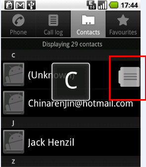 今天想实现android通讯录中,那种手动可以拖拽着滚动条滑动的效果,如下图: