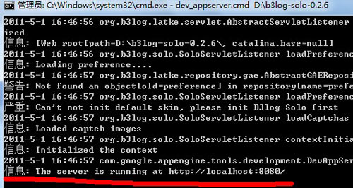 输入:dev_appserver.cmd D:\b3log-solo-0.2.6;启动完成后,如图: