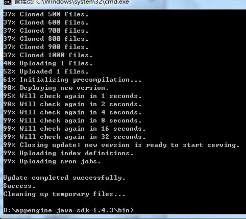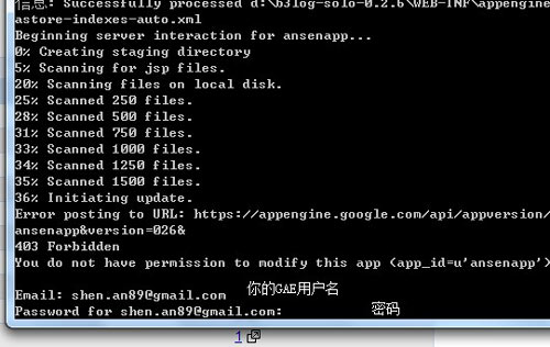 然后在CMD里面输入appcfg.cmd update D:\b3log-solo-0.2.6,输入你的GAE账号和密码(输密码的时候不会有显示),