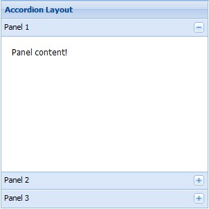 Ext.create('Ext.panel.Panel', { title: 'Accordion Layout', width: 300, height: 300, x:20, y:20, layout:'accordion', defaults: { bodyStyle: 'padding:15px' }, layoutConfig: { titleCollapse: false, animate: true, activeOnTop: true }, items: [{ title: 'Panel 1', html: 'Panel content!' },{ title: 'Panel 2', html: 'Panel content!' },{ title: 'Panel 3', html: 'Panel content!' }], renderTo: Ext.getBody() });