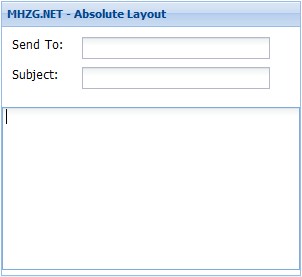 Ext.create('Ext.form.Panel', { title: 'MHZG.NET - Absolute Layout', width: 300, height: 275, x:20, y:90, layout:'absolute', defaultType: 'textfield', items: [{ x: 10, y: 10, xtype:'label', text: 'Send To:' },{ x: 80, y: 10, name: 'to', anchor:'90%' },{ x: 10, y: 40, xtype:'label', text: 'Subject:' },{ x: 80, y: 40, name: 'subject', anchor: '90%' },{ x:0, y: 80, xtype: 'textareafield', name: 'msg', anchor: '100% 100%' }], renderTo: Ext.getBody() });