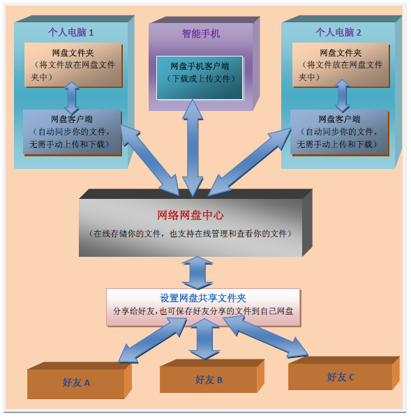 网盘,也就是网络硬盘,可以帮你存储你的个人数据,你能在不同电脑,不同系统上共享同一份数据,免去了硬盘坏掉丢失数据,在不同电脑和手持设备之间访问和保持数据同步,同事还能给同学朋友分享你想要分享的内容,的确很方便。