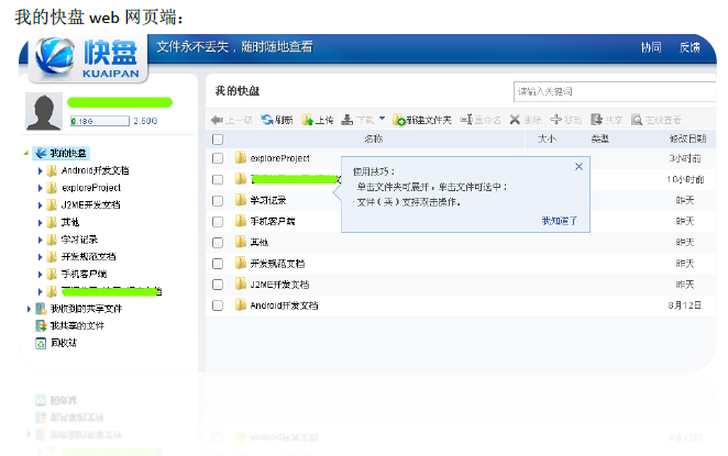 安装客户端成功后,会让你设置一个本地快盘文件夹,将文件放到该文件夹中,客户端会自动将文件上传到网络快盘,同时也会将快盘中之前有的文件下载到本地 实现同步,客户端做的还是不错的,资源占用小。