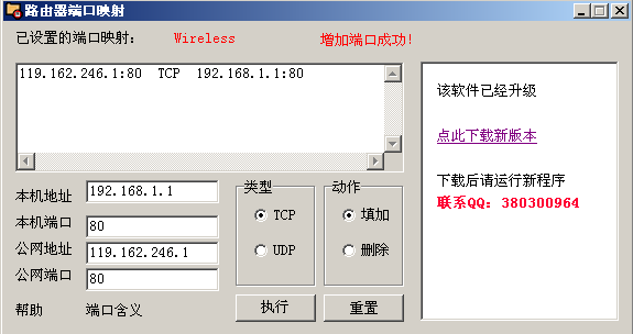 轻松实现外网访问内网 点此下载路由设置软件(绿色免安装),解压后运行port.exe,在如图界面中进行如下设置:1.设置要映射到本机的“公网端口”;2.设置你的服务器监听的“本机端口”;3.点击执行.OK!试一下用公网地址访问你的网站吧! 1 楼 caoxiaoj2ee 2011-11-25 好用,不错啊