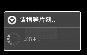 strings.xmlpackage londing.test;import android.app.Activity;import android.app.ProgressDialog;import android.os.Bundle;import android.view.View;import android.widget.Button;import android.widget.TextView;public class LoadingTest extends Activity { /** 在Android里是通过ProgressDialog来运行加载对话框,但留意的是 Android的ProgressDialog必须在 *后台程序运行完毕之前以dismiss()方法来关闭取得(focus)焦点,否则成寻会陷入无限循环无法终止程序, *或者在线程里不可有任何的更改Context或paren View的任何状态,文字输出等事件。*/private TextView text=null;/**声明一个ProgressDialog*/public ProgressDialog myDialog=null; @Override public void onCreate(Bundle savedInstanceState) { super.onCreate(savedInstanceState); /**载入main.xml*/ setContentView(R.layout.main); /**通过ID找到Button组件*/ Button bt=(Button)findViewById(R.id.loading); /**设置Button按钮点击事件*/ bt.setOnClickListener(new Button.OnClickListener(){ public void onClick(View v){ /**设置ProgressDialog标题文字*/ final CharSequence title=getString(R.string.dialog_title); /**设置ProgressDialog消息文字*/ final CharSequence messge=getString(R.string.dialog_messge); /**设置ProgressDialog消息,标题文字显示*/ myDialog=ProgressDialog.show(LoadingTest.this, title, messge,true); /**通过ID找到TextView组件*/ text=(TextView)findViewById(R.id.text); /**设置TextView文字*/ text.setText(messge); new Thread(){ public void run(){ try{ /**线程睡眠*/ sleep(3000); }catch(Exception e){ e.printStackTrace(); }finally{ /**关闭ProgressDialog*/ myDialog.dismiss(); } } /**开启线程*/ }.start(); } }); }}
