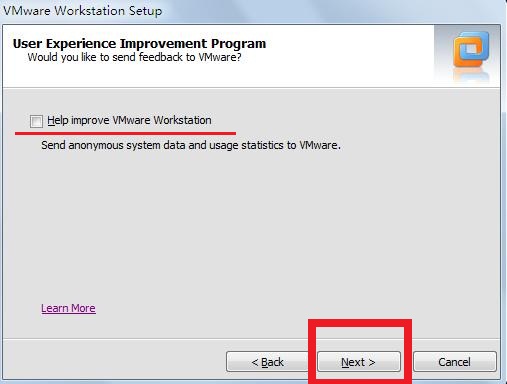 第六步,询问你是否向VMware发送反馈消息,我这里没有选择,尽可能地减少内存消耗,之后点击“Next”进如下一步的安装流程,如下图: