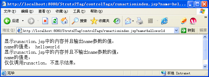 注释:s:action标签的属性executeResult值为True时,代表返回一个结果页面在JSP页面中显示;s:action标签属性ignoreContextParams值为True时,代表忽略URL中的参数。6.运行结果