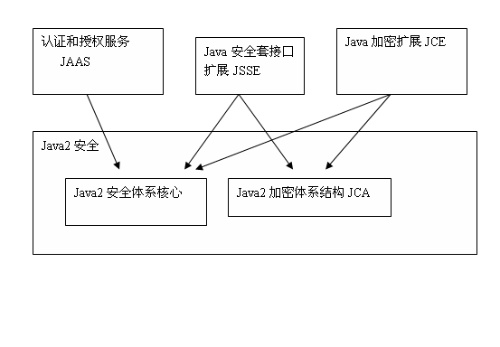 java的安全体系分为两部分:java2资源访问控制和java加密体系结构(JCA)。同时还提供了java安全扩展增强功能:认证和授权服务JAAS,java安全套接口扩展JSSE,java加密扩展JCE,如图: