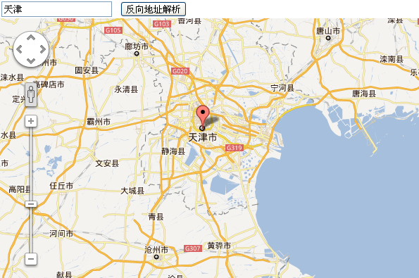 <!DOCTYPE html PUBLIC "-//W3C//DTD XHTML 1.0 Transitional//EN" "http://www.w3.org/TR/xhtml1/DTD/xhtml1-transitional.dtd"><html><head><meta name="viewport" content="initial-scale=1.0, user-scalable=no" /><meta http-equiv="Content-Type" content="text/html;charset=GBK" /><title>反向解析地址</title><style>html,body{height:100%;margin:0;padding:0;}#map_canvas{height:87%;}@media print{html,body{height:auto;}#map_canvas{height:100%;}}</style><script type="text/javascript" src="http://maps.google.com/maps/api/js?sensor=false&language=zh-CN"></script><script type="text/javascript">// map.js  startvar $G,$O,$M,$L,$I;(function(undefined){O = function (id) {return "string" == typeof id ? document.getElementById(id):id;};MP = {y:39.9,x:116.4,point:function(y,x){return new google.maps.LatLng(y,x);},getCanvas:function(id){var mapid = id?id:'map_canvas';return document.getElementById(mapid);},options:function(center,z){return {zoom: z?z:14,center: center?center:this.getCenter(),navigationControl: true,scaleControl: true,streetViewControl: true,mapTypeId: google.maps.MapTypeId.ROADMAP}},}M = {mark:function(map,latLng,title){if(title)return new google.maps.Marker({icon: this.icon,position: latLng,map: map,title:title});else return new google.maps.Marker({//icon: this.icon,position: latLng,map: map});}}I = {infos:[],add:function(info,latLng,w,h){if(w&&h)return new google.maps.InfoWindow({content: info,size: new google.maps.Size(w,h),position: latLng});else if(latLng)return new google.maps.InfoWindow({content: info,position: latLng});elsereturn new google.maps.InfoWindow({content: info});}}//event 事件L = {listen:null,add:function(dom,event,fn){return google.maps.event.addDomListener(dom, event, fn);},addOnce:function(dom, event, fn){return google.maps.event.addListenerOnce(dom, event, fn)}}$G = MP;$O = O;$M = M;$L = L;$I = I;})();// map.js  end</script><script type="text/javascript">var map;var geocoder = new google.maps.Geocoder(); //申明地址解析对象var z = 8;function initialize(){var point = $G.point($G.y,$G.x);//初始中心点map = new google.maps.Map($G.getCanvas("map_canvas"), $G.options(point,z));//初始化地图}function searchaddress(){var address = $O("address").value;if (geocoder) {geocoder.geocode( { 'address': address,"language":"zh_cn"}, function(results, status) {if (status == google.maps.GeocoderStatus.OK) {if(results[0]){var point = results[0].geometry.location;map.setCenter(point);var marker = $M.mark(map,point);$L.add(marker,"click",function(){$I.add("我在这里").open(map,marker);})}} else {alert("Geocode was not successful for the following reason: " + status);}});}}</script></head><body onload="initialize()">    <form id="form1" runat="server" action="#">    <div>        <input id="address" type="textbox" value="天津">        <input type="button" value="反向地址解析" onclick="searchaddress()">    </div>    </form>    <div id="map_canvas"></div></body></html>