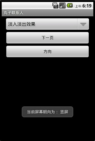package com.iaiai.activity;import android.app.Activity;import android.content.pm.ActivityInfo;import android.content.res.Configuration;import android.os.Bundle;import android.view.View;import android.view.View.OnClickListener;import android.widget.Button;import android.widget.Toast;public class IaiaiActivity extends Activity {@Overrideprotected void onCreate(Bundle savedInstanceState) {super.onCreate(savedInstanceState);onScreenChanged(getResources().getConfiguration().orientation);setContentView(R.layout.main);Button btnfx = (Button) findViewById(R.id.btn_fx);btnfx.setOnClickListener(new OnClickListener() {@Overridepublic void onClick(View v) {// 判断是否可以获得requestedOrientation属性if (getRequestedOrientation() == -1) {Toast.makeText(IaiaiActivity.this, "系统的朝向无法获取",Toast.LENGTH_LONG).show();} else {if (getRequestedOrientation() == ActivityInfo.SCREEN_ORIENTATION_LANDSCAPE) {setRequestedOrientation(ActivityInfo.SCREEN_ORIENTATION_PORTRAIT);} else if (getRequestedOrientation() == ActivityInfo.SCREEN_ORIENTATION_PORTRAIT) {setRequestedOrientation(ActivityInfo.SCREEN_ORIENTATION_LANDSCAPE);}}}});}/** * 手机横屏 * * @param direction */public void onScreenChanged(int direction) {switch (direction) {case ActivityInfo.SCREEN_ORIENTATION_USER:Log.i("***************", "当前屏幕朝向为: 横屏");break;}}/** * 手机竖屏 * * @param newConfig */@Overridepublic void onConfigurationChanged(Configuration newConfig) {switch (newConfig.orientation) {case ActivityInfo.SCREEN_ORIENTATION_PORTRAIT:Log.i("***************", "当前屏幕朝向为: 竖屏");break;}super.onConfigurationChanged(newConfig);}}