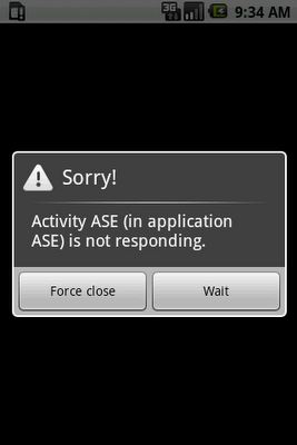 接下来,当我尝试单击saytime.py运行它的时候,系统大约有1分钟左右没有任何反应,当我尝试Back键等操作的时候,就会出 现”Sorry! Activity ASE(in applicaton ASE) is not responding”的错误,同时从logcat中可以看到ANR(application not responding)的记录被写入了/data/anr/traces.txt。