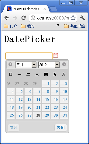 <html><head><base href="<%=basePath%>" /><link type="text/css" href="css/overcast/jquery-ui-1.7.3.custom.css" rel="stylesheet" /><link type="text/css" href="css/me.css" rel="stylesheet" /><script type="text/javascript" src="js/jquery-1.7.2.min.js"></script><script type="text/javascript" src="js/jquery-ui-1.7.3.custom.min.js"></script><script type="text/javascript" src="js/me.js"></script><script type="text/javascript">$(document).ready(function(){init("<%=basePath%>");});</script><title>jquery-ui-datapick</title></head><body><h1>DatePicker</h1><input type="text" id="datepicker" name="birthday" /></body></html>$('#datepicker').datepicker({inline: false,disabled: false,dateFormat: 'yy/mm/dd',// 设置日期格式dayNames: ['星期日', '星期一', '星期二', '星期三', '星期四', '星期五', '星期六'],dayNamesMin: ['日', '一', '二', '三', '四', '五', '六'],monthNames : ['一月', '二月', '三月', '四月', '五月', '六月', '七月', '八月', '九月', '十月', '十一月', '十二月'],monthNamesShort : ['一月', '二月', '三月', '四月', '五月', '六月', '七月', '八月', '九月', '十月', '十一月', '十二月'],changeMonth: true,// 下拉框选择月份changeYear: true,// 下拉框选择年份yearRange: "1950:2020",// 下拉列表中年份范围showOtherMonths: true,// 显示其他月份的日期selectOtherMonths: false,// 允许选择其他月份的日期showAnim: 'drop',// 动画效果风格minDate: new Date(1950, 1-1, 1),// 本控件可以选的最小日期maxDate: new Date(2020, 12-1, 31), // 本控件可以选的最大日期showMonthAfterYear: true,// 是否在面板的头部年份后面显示月份nextText: '一个月',// 更改按钮提示文本prevText: '上一月',// 更改按钮提示文本closeText: '关闭',// 更改按钮提示文本currentText: '本月',// 更改按钮提示文本showButtonPanel: true,// 显示按钮面板buttonText: '日历',// 日历按钮提示文本showOn: "button",// 日历按钮触发 ['focus', 'button', 'both'] 三选一buttonImage: basePath + "/images/calendar.gif", // 日历按钮buttonImageOnly: true// 按钮不显示文字});.ui-datepicker { width: 17em; padding: .2em .2em 0;}.ui-datepicker { width: 17em; padding: .2em .2em 0; font: 75% "Trebuchet MS", sans-serif;}