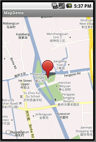 /** * */package com.decarta.demo;import java.io.IOException;import java.util.List;import java.util.Locale;import android.app.AlertDialog;import android.app.Dialog;import android.content.Context;import android.graphics.Bitmap;import android.graphics.BitmapFactory;import android.graphics.Canvas;import android.graphics.Point;import android.location.Address;import android.location.Geocoder;import android.os.Bundle;import com.google.android.maps.GeoPoint;import com.google.android.maps.MapActivity;import com.google.android.maps.MapController;import com.google.android.maps.MapView;import com.google.android.maps.Overlay;import com.google.android.maps.Projection;/** * @author Tony Shen * */public class Main extends MapActivity {// 地图显示控制相关变量定义private MapView map = null;private MapController mapCon;private Geocoder geo;private static final int ERROR_DIALOG = 1;/** Called when the activity is first created. */@Overridepublic void onCreate(Bundle savedInstanceState) {super.onCreate(savedInstanceState);setContentView(R.layout.main);geo = new Geocoder(this, Locale.CHINA);// 获取MapViewmap = (MapView) findViewById(R.id.map);// 设置显示模式map.setTraffic(true);map.setSatellite(false);map.setStreetView(true);// 设置可以缩放map.setBuiltInZoomControls(true);List<Address> addresses = null;try {addresses = geo.getFromLocationName("江苏省苏州市寒山寺", 1);} catch (IOException e) {// TODO Auto-generated catch blocke.printStackTrace();}if(addresses.size() == 0) {showDialog(ERROR_DIALOG);GeoPoint geoBeijing = new GeoPoint((int) (39.906033* 1000000),(int) (116.397700 * 1000000));mapCon = map.getController();mapCon.setCenter(geoBeijing);mapCon.setZoom(4);} else {Address address = addresses.get(0);// 设置初始地图的中心位置GeoPoint geoPoint = new GeoPoint((int) (address.getLatitude() * 1000000),(int) (address.getLongitude() * 1000000));mapCon = map.getController();mapCon.setCenter(geoPoint);mapCon.setZoom(16);List<Overlay> overlays = this.map.getOverlays(); overlays.add(new PositionOverlay(geoPoint, this, R.drawable.ic_red_pin));}}@Overrideprotected boolean isRouteDisplayed() {return false;}@Overrideprotected Dialog onCreateDialog(int id) {return new AlertDialog.Builder(this).setTitle("查询出错哦").setMessage("路名/地名出错,请重新输入!").create();}class PositionOverlay extends Overlay {private GeoPoint geoPoint; private Context context; private int drawable; public PositionOverlay(GeoPoint geoPoint, Context context, int drawable) { super(); this.geoPoint = geoPoint; this.context = context; this.drawable = drawable; }@Override public void draw(Canvas canvas, MapView mapView, boolean shadow) { Projection projection = mapView.getProjection(); Point point = new Point(); projection.toPixels(geoPoint, point); Bitmap bitmap = BitmapFactory.decodeResource(context.getResources(), drawable); canvas.drawBitmap(bitmap, point.x-bitmap.getWidth()/2 , point.y-bitmap.getHeight(), null); super.draw(canvas, mapView, shadow); } }}