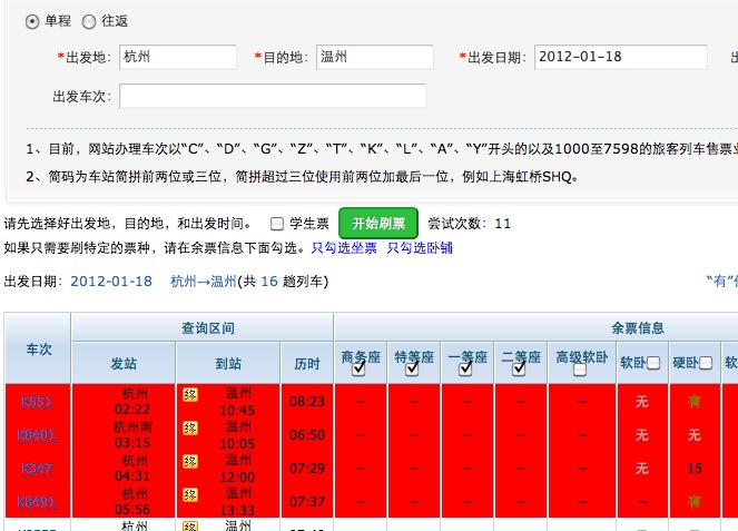 登录之后到车票预订页面,选择好出发地,目的地,和出发时间,点击开始刷票,就会不断更新火车票,只到有票为止,刷到之后会有通知提示和声音提示