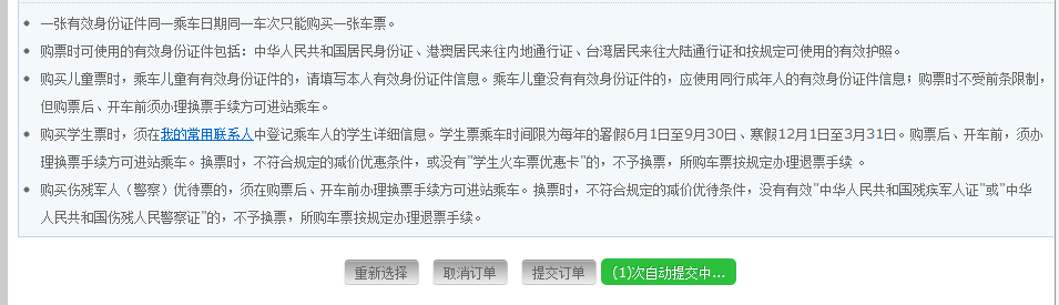 当跳转到订单页时,如果没有选择用户会自动选择第一个用户,需要用户自己输入验证码自动提交订单功能会在用户过多等预订失败的情况下,自动重新提交订单