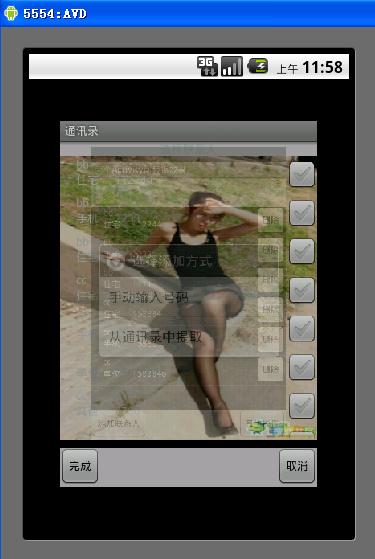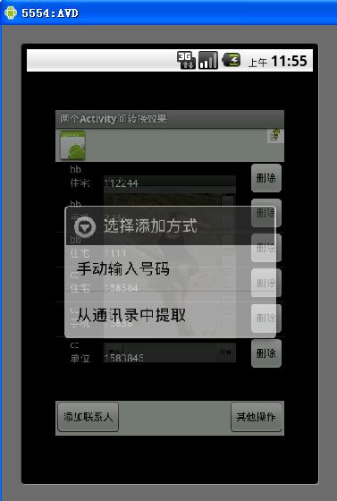 //这段只是示例代码,要看到我下面的图片演示的结果还需要自己写相应的ActivityIntent intent = new Intent(FirstActivity.this, SecondActivity.class);startActivityForResult(intent, 11); //添加界面切换效果,注意只有Android的2.0(SdkVersion版本号为5)以后的版本才支持int version = Integer.valueOf(android.os.Build.VERSION.SDK); if(version >= 5) { overridePendingTransition(R.anim.zoomin, R.anim.zoomout); //此为自定义的动画效果,下面两个为系统的动画效果 //overridePendingTransition(android.R.anim.fade_in,android.R.anim.fade_out); //overridePendingTransition(android.R.anim.slide_in_left,android.R.anim.slide_out_right);} <?xml version="1.0" encoding="utf-8"?><set xmlns:android="http://schemas.android.com/apk/res/android" android:interpolator="@android:anim/decelerate_interpolator" android:zAdjustment="top"> <scale android:fromXScale="1.0" android:toXScale=".5" android:fromYScale="1.0" android:toYScale=".5" android:pivotX="50%p" android:pivotY="50%p" android:duration="3000" /> <!-- 系统内置的动画持续时间 android:duration="@android:integer/config_mediumAnimTime" --> <alpha android:fromAlpha="1.0" android:toAlpha="0" android:duration="3000"/></set>