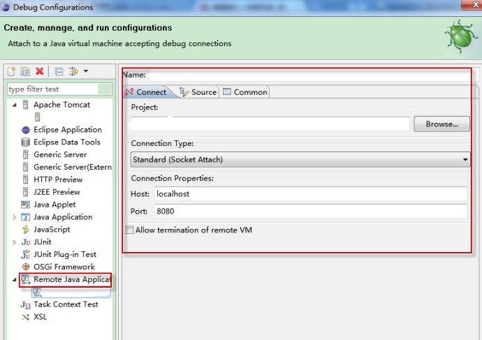 第一次运行时,需要先建立这个Remote Java Application. 方法为打开"Debug"->"Open Debug Dialog",新建一个Remote Java Application, 给个合适的名字,Connection Type选择"Standard(Socket Attach)", Host和端口指定为localhost:8000(和上面tomcat中配置的端口一致),如下图示: