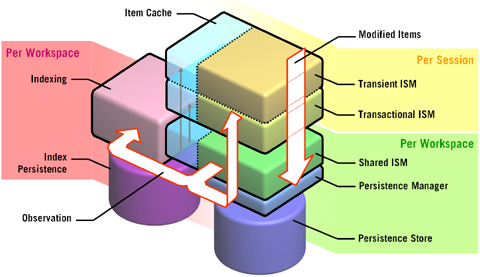 jackRabbit如何工作 下图说明了jackRabbit是如何的工作!所有的工作都是基于JCR API来操作的。包括有工作区(workSpace)、会话(Session)、缓存(Cache)、查询搜索(index)、持久存储(Persistence Store)。