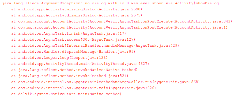 大家可以看到屏幕中央有一个ProgressDialog 提示正在验证账户,验证的过程是通过一个异步任务来完成的,但是如果这时我不停的点击Back键--》一定要不停的点,就会抛出一个异常,异常见下图。