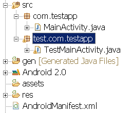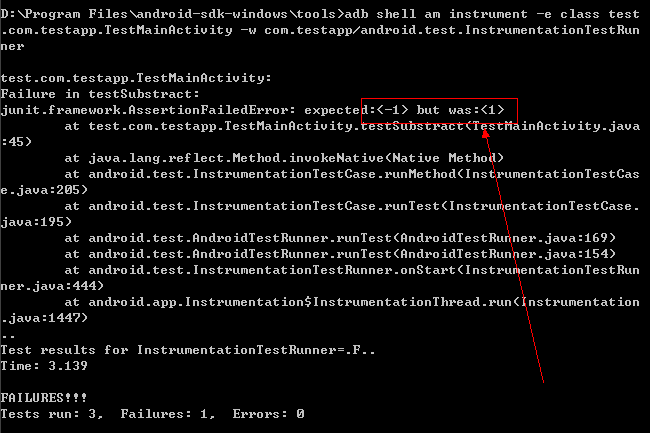 package com.testapp;import android.app.Activity;import android.os.Bundle;public class MainActivity extends Activity{/** Called when the activity is first created. */@Overridepublic void onCreate(Bundle savedInstanceState){super.onCreate(savedInstanceState);setContentView(R.layout.main);}/** * 求a+b * * @param a * @param b * @return */public int sum(int a, int b){return a + b;}/** * 求a-b * * @param a * @param b * @return */public int substract(int a, int b){return a - b;}}package test.com.testapp;import com.testapp.MainActivity;import android.app.Activity;import android.test.ActivityInstrumentationTestCase;import android.test.suitebuilder.annotation.MediumTest;public class TestMainActivity extends ActivityInstrumentationTestCase<MainActivity>{public TestMainActivity(){super("com.testapp", MainActivity.class);}/** * @param pkg * @param activityClass */public TestMainActivity(String pkg, Class<MainActivity> activityClass){super(pkg, activityClass);// TODO Auto-generated constructor stub}@MediumTestpublic void testSum(){assertEquals(3, getActivity().sum(1, 2));}@MediumTestpublic void testSubstract(){assertEquals(-1, getActivity().substract(1, 2));}}
