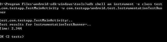 <?xml version="1.0" encoding="utf-8"?><manifest xmlns:android="http://schemas.android.com/apk/res/android"package="com.testapp" android:versionCode="1" android:versionName="1.0"><application android:icon="@drawable/icon" android:label="@string/app_name"><activity android:name=".MainActivity" android:label="@string/app_name"><intent-filter><action android:name="android.intent.action.MAIN" /><category android:name="android.intent.category.LAUNCHER" /></intent-filter></activity><uses-library android:name="android.test.runner" /></application><instrumentation android:name="android.test.InstrumentationTestRunner"android:targetPackage="com.testapp" android:label="Test for my app" /></manifest>