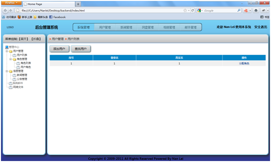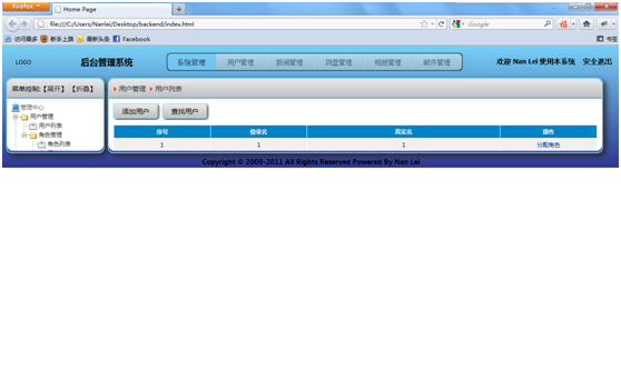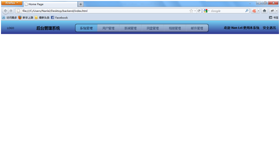<!DOCTYPE html><html><head><title>Home Page</title><meta http-equiv="content-type" content="text/html;charset=UTF-8"><link rel="stylesheet" type="text/css" href="css/index.css" /></head><body><div id="wrapper"><div id="header"><div id="logo">LOGO</div><div id="title">后台管理系统</div><div id="menu"></div><div id="user_info"><div id="welcome">欢迎 Nan Lei 使用本系统</div><div id="logout">安全退出</div></div></div></div></body></html>