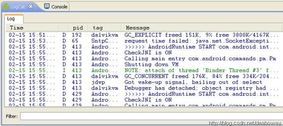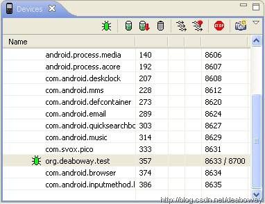 Device 中罗列了Emulator中所有的进程,选项卡右上角那一排按钮分别为:Debug the selected process调试进程、Update Heap更新进程堆栈信息、Dump HPROF file检查HPROF(Heap/CPU Profiling Tool)文件、Cause GC调用垃圾回收、更新进程Update Threads、Start Method Profiling开始方法分析、Stop Process停止某个进程,和Screen Capture抓取 Emulator目前的屏幕。当你选中某个进程,并按下调试进程按钮时,如果eclipse中有这个进程的代码,那就可以进行源代码级别的调试。有点像 gdb attach。图片抓取按钮可以把当前android的显示桌面抓到你的机器上,也是非常有用。