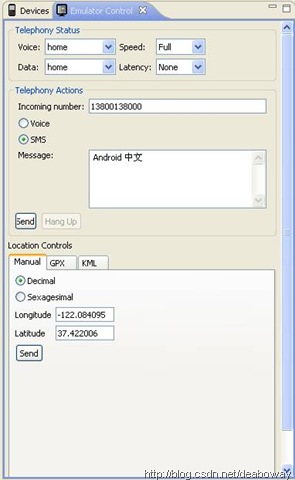 通过这个面板的一些功能可以非常容易的使测试终端模拟真实手机所具备的一些交互功能,比如:接听电话,根据选项模拟各种不同网络情况,模拟接受SMS消息和发送虚拟地址坐标用于测试GPS功能等。