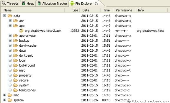 显示文件系统信息。File Explorer非常有用:它可以把文件上传到Android、或者从Android上下载文件下来、也可以进行文件删除操作。选项卡右上角有上传、下载、删除三个按钮。一般情况下,File Explorer会有如下三个目录:data、sdcard、system。