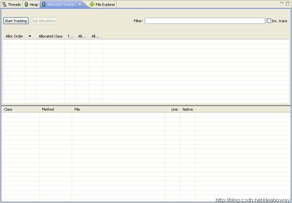 在Allocation Tracker视图里,我们可以跟踪每个选中的虚拟机的内存分配情况。点击”Start Tracking”后点击”Get Allocations “就可以看到。
