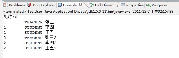 package com.kevin.demo;import java.util.ArrayList;import java.util.List;import org.apache.commons.lang.builder.EqualsBuilder;import org.apache.commons.lang.builder.HashCodeBuilder;/** * @author <a href="mailto:foohsinglong@gmail.com">kevin.long</a> * @description 2011-12-07 02:14:58 */public class TestUser {/** * 班级 */private Integer classes; /** * 类型(teacher or student) */private String type;/** * 姓名 */private String name;public TestUser(Integer classes, String type, String name){this.classes = classes;this.type = type;this.name = name;}@Overridepublic boolean equals(Object other) {if(!(other instanceof TestUser)){return false;}TestUser testUser = (TestUser)other;return new EqualsBuilder().append(classes, testUser.getClasses()).append(type, testUser.getType()).append(name, testUser.getName()).isEquals();}@Overridepublic int hashCode() {return new HashCodeBuilder().append(classes).append(type).append(name).toHashCode();}public String getType() {return type;}public void setType(String type) {this.type = type;}public String getName() {return name;}public void setName(String name) {this.name = name;}public Integer getClasses() {return classes;}public void setClasses(Integer classes) {this.classes = classes;}/** * 归并排序法 * @param users 需要排序集合 */public static void quickSort(List<TestUser> users) {quickSort(users, 0, users.size() - 1);}private static void quickSort(List<TestUser> users, int start, int end) { int left = start; int right = end - 1; int pivot = users.get(end).getClasses(); int typeKey = users.get(end).getName().hashCode(); while (left < right) { if (users.get(left).getClasses() <= pivot) { left++; continue; } if (users.get(right).getClasses() > pivot) { right--; continue; } swap(users, left++, right); } if (users.get(left).getClasses() < pivot) { left++; }else if(users.get(left).getClasses() == pivot){ if(users.get(left).getName().hashCode() < typeKey){ left++; } } swap(users, left, end); if(left - 1 > start) { quickSort(users, start, left - 1); } if(left + 1 < end) { quickSort(users, left + 1, end); }}private static void swap(List<TestUser> userSwaps, int a, int b) {TestUser t = userSwaps.get(a);userSwaps.set(a, userSwaps.get(b));userSwaps.set(b, t);}/** * 现有List集合中存放有10W个无序的User(属性:classes 班级;type 身份【学生 or 老师】;name 姓名)对象。 * 要求:用JAVA实现将List集合中的User对象按照1-n班并且每个班的老师必须放在该班级学生的前面输出。 * (一个班只有一个老师,一个班存在多个老师,这两只情况可以分开用两个算法实现,也可以用一个算法实现,但要考虑性能)例如下面格式: * 1班 老师 张三 * 1班 学生 李四 * 1班 学生 王五 * 2班 老师 张三2 * 2班 学生 李四2 * 2班 学生 王五2 */public static void main(String[] args) {List<TestUser> users = new ArrayList<TestUser>();users.add(new TestUser(1, TestUserType.TEACHER, "张三"));users.add(new TestUser(2, TestUserType.TEACHER, "张三2"));users.add(new TestUser(1, TestUserType.STUDENT, "李四"));users.add(new TestUser(2, TestUserType.STUDENT, "李四2"));users.add(new TestUser(1, TestUserType.STUDENT, "王五"));users.add(new TestUser(2, TestUserType.STUDENT, "王五2"));long start = System.currentTimeMillis();quickSort(users); //排序优先级 班级,老师System.out.println("耗时:" + (System.currentTimeMillis() - start));for(TestUser user : users){System.out.println(user.getClasses() +"\t"+ user.getType() +"\t"+ user.getName());}}}